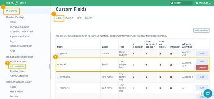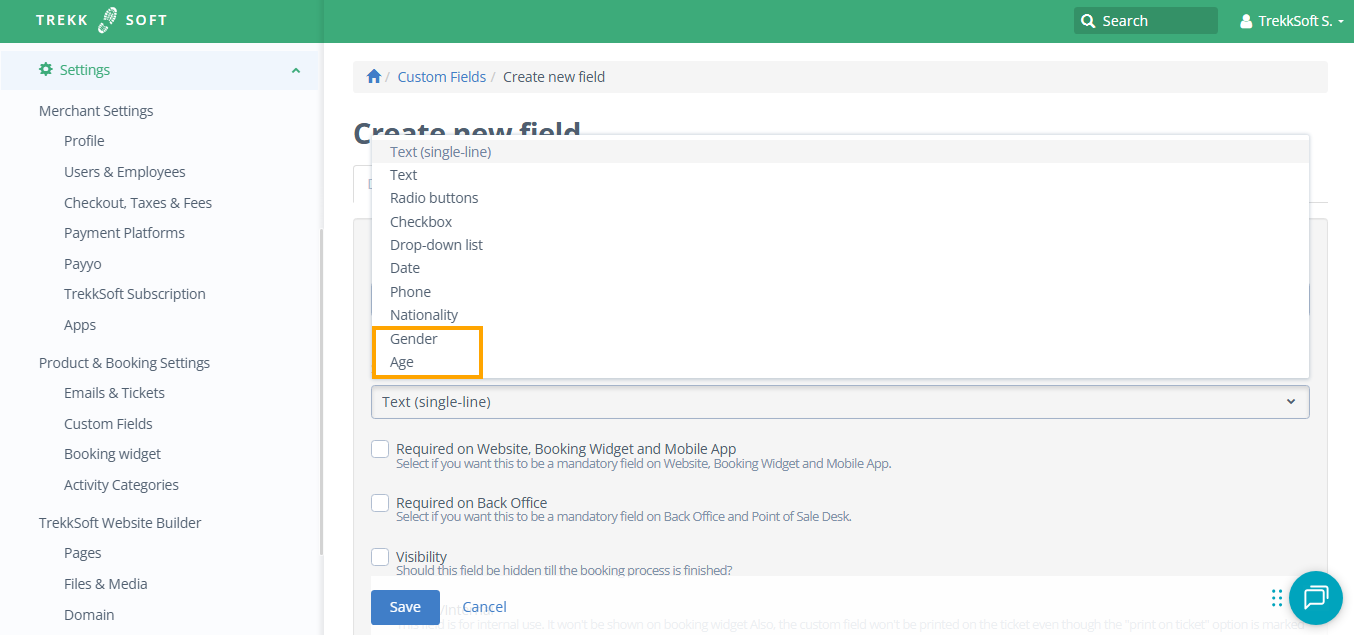 For both of those Custom Fields, there is a preset field in TrekkSoft, that you can see on the "Field type" drop-down when creating new custom fields.