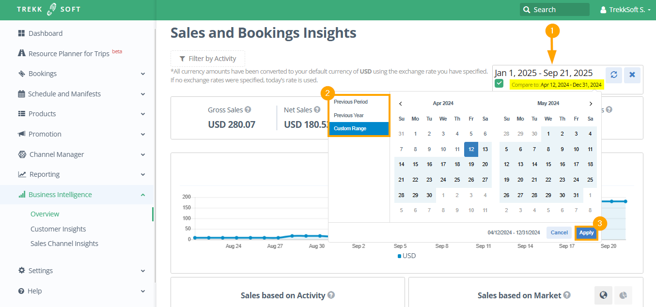 You can choose a pre-set period or choose a custom range with the time frame of your interest. It can also be interesting to compare two different periods, for example, this summer's performance compared to the year before, to see how seasonality might affect your business.