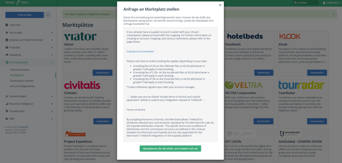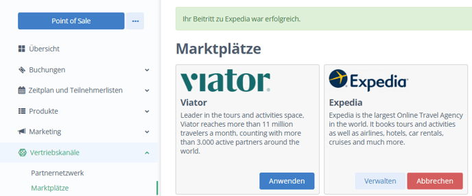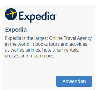 Falls Sie bereits einen Account bei Expedia haben, gehen Sie zum Menüpunkt Marktplätze in TrekkSoft um die Verbindung freizuschalten. Dort finden Sie Expedia in der Liste:
