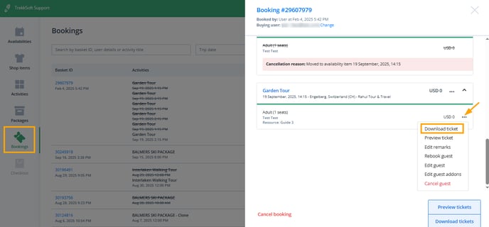 - The guest and activity ticket can be accessed by again clicking on the familiar three dots (...) next to the guest and select Download ticket option from the list.