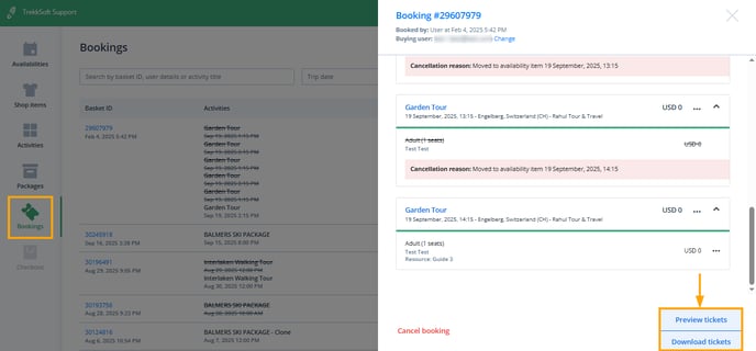 - To Preview or download all tickets associated with a basket, access it by opening a basket and clicking on Preview tickets or Download tickets button available in the bottom right corner.