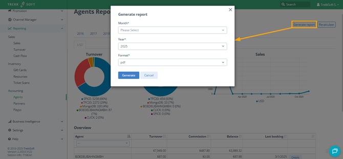 By clicking on Generate report, you'll see a pop-up window that will generate a document with the transactions for an entire month, select the desired month, the format you’d like to get your report in and hit Generate.