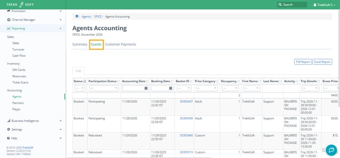 On top, you have the different tabs that list the actual booking items or baskets so you can explain each number on the summary page. Remember all the guests (Guests tab) show up here if they are booked in a basket that has you this agent set. If the basket is not allocated to this agent then the guests do not show up, even if the agent took the money.