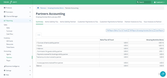 The Partners accounting shows you how many bookings you made for partners, how much commission you earned and how much money you owe to a partner and the same for the partner as well.