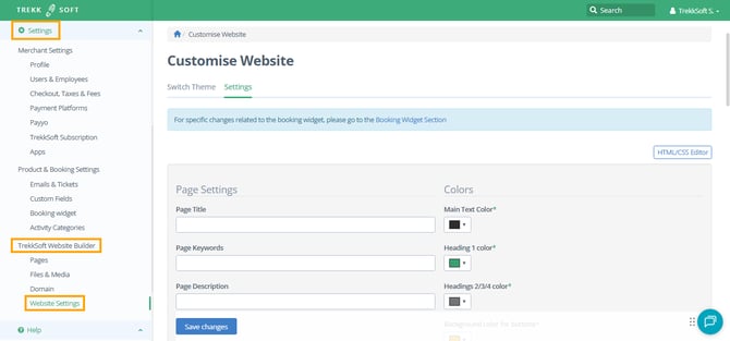 Start by heading to the left navigation menù and clicking on Settings. Then, navigate to TrekkSoft Website Builder > Website Settings.