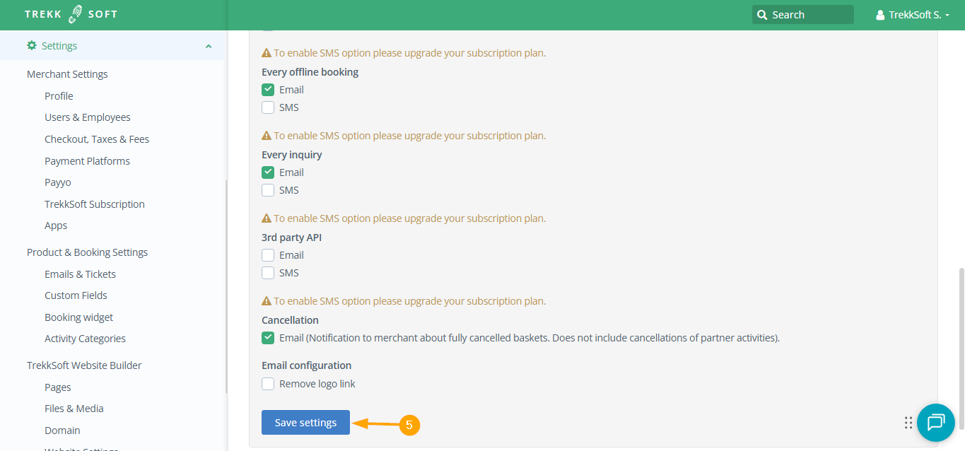 - Once you are logged in, on the left-hand side go to Settings> Product and Booking Settings> Emails & Tickets