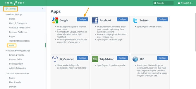 Once you've copied over the Measurement ID, go to your TrekkSoft website and then go to your Google App page, you can get to this page by navigating to Settings > Apps > Google from your TrekkSoft Admin Desk.