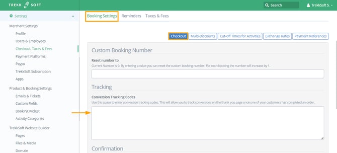 In the window on the right, navigate to Booking Settings > Checkout . From here enter the Tracking code on the Tracking > Conversion Tracking Codes section. Once done, click Save button at the bottom of the page.