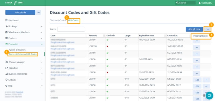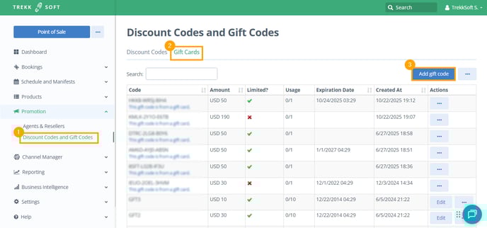 - In your TrekkSoft Backoffice/Admin Desk, go to Promotion > Discount Codes and Gift Cards