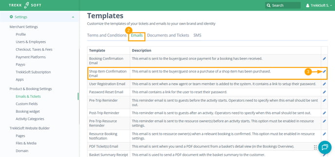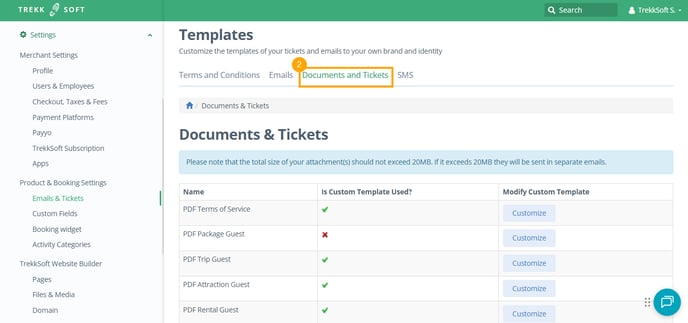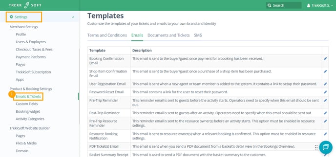 - In your TrekkSoft Backoffice/Admin Desk, navigate to Settings > Product & Booking Settings > Email & Tickets.