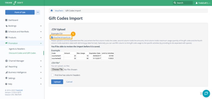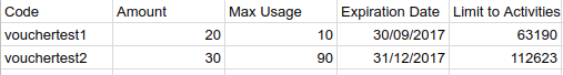- Now, you'll see a template that you need to follow to import the gift codes. Click VouchersImport.csv to download the csv file.
