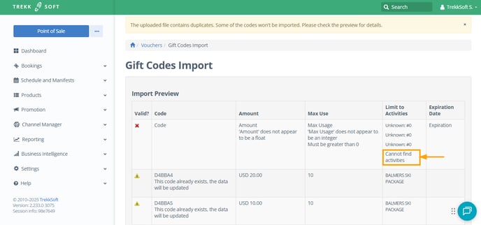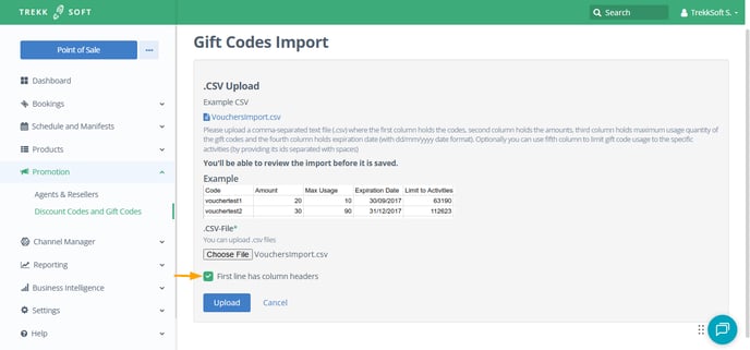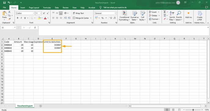 - Be sure to update the specific activity ID from your TrekkSoft account in the "Limit to activities" column of your CSV file. If you want the code to apply to all your activities, simply leave this field blank.