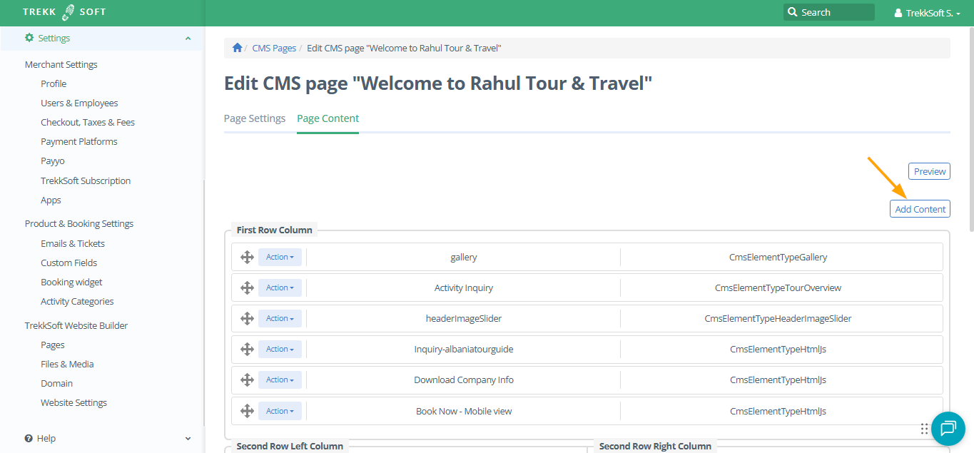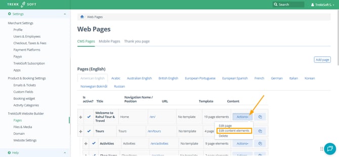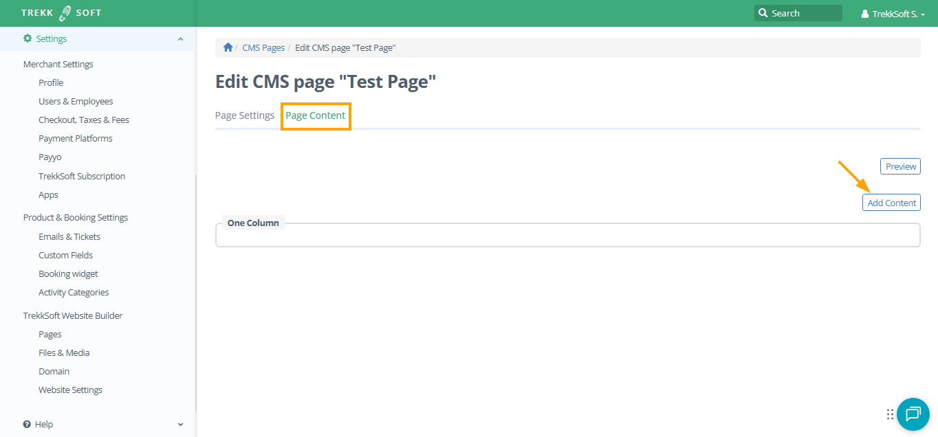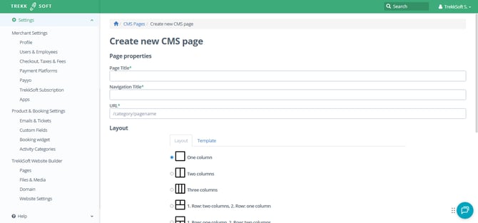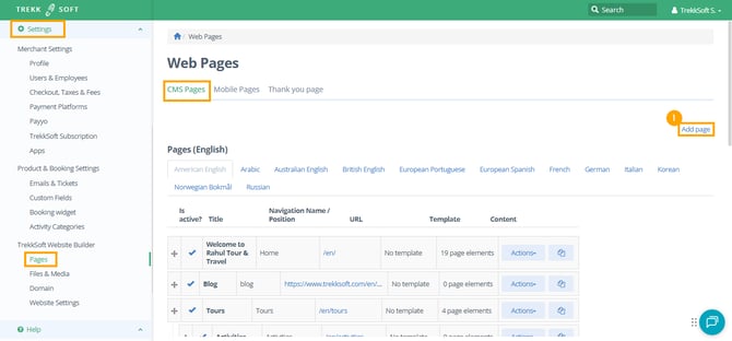 To create a page go to Settings > TrekkSoft Website Builder > Pages from the left menù and then click on the Add Page button under CMS Pages on the right.