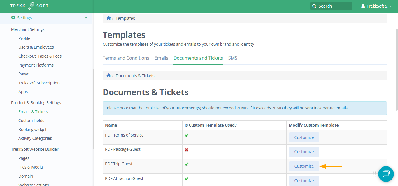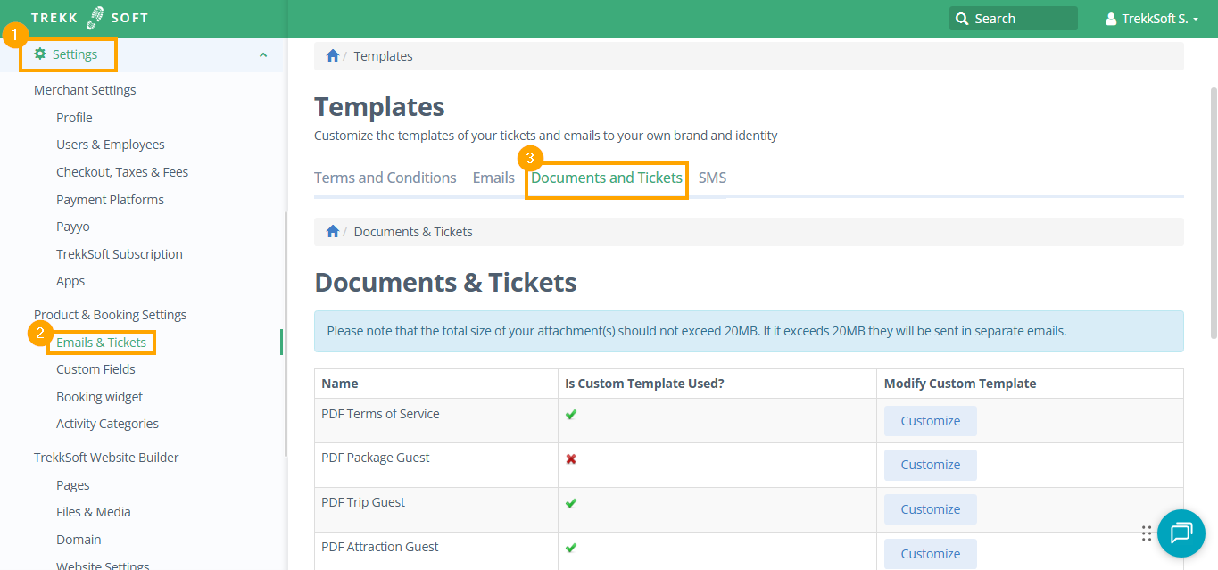 Navigate to Settings > Product & Booking Settings > Emails & Tickets and click on the Document and Tickets Tab.