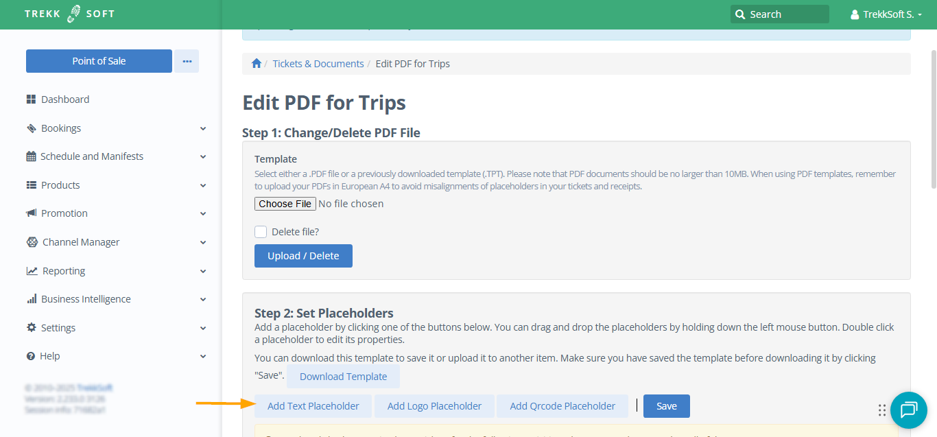 The first time you edit any PDF template, click on the “Create Copy” button to view the template. From there, you can freely add or edit existing placeholders inside the ticket.