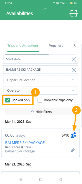 Filter the Booked only trips and click on an active (blue) icon in the availability to access the guest manifest. You can also access the guest manifest from the booking itself.