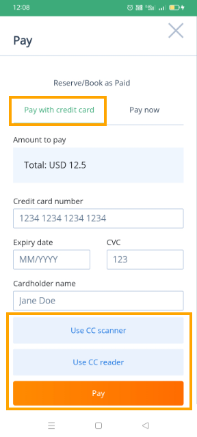- Pay with credit card - Pay for the booking using the credit card. You can simply use the form and type manually in the credit card details, or you use the credit card scanner or the credit card reader option.