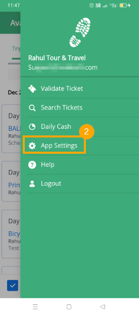 - 3 bars icon: Menu with: Validate Ticket, Search Tickets, Daily Cash, Help, Logout. Also in the menu you find the merchant's name and email address at the top.