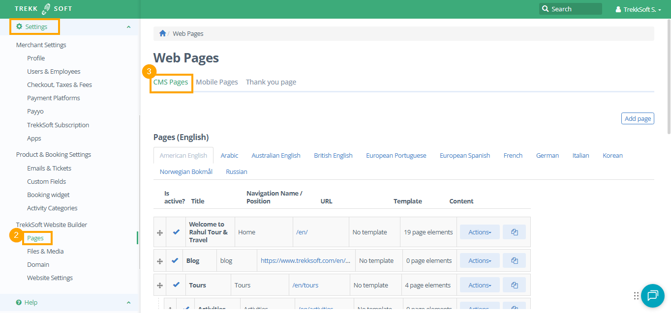 - On the left-hand side menu, navigate to Settings > TrekkSoft Website Builder > Pages.