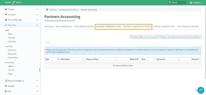 - Customer Payments to You & Customer Payments to Partner: There are cases where the partner makes the reservation on their account but then the customer pays the partner account directly. As our system doesn’t connect actual guests directly to a payment we cannot settle this easily. That’s why our system shows those payments and links to the basket based on the booking/payment date and not on the booking date. So our system always thinks that the merchant who sold the activity will pay out the partner at the departure date and those direct payments would need to be paid back first. Example: Your partner sells an activity of yours in April to a guest that will depart in May. The customer directly pays the partner and not you. So in the partner accounting, this guest would show up in May including the price and the commission but in the April accounting the customer payment would show up that you would need to pay back to the partner so he can pay you back in May. As our system is built this way that we don’t link payments and guests directly there is no other way for us to show.