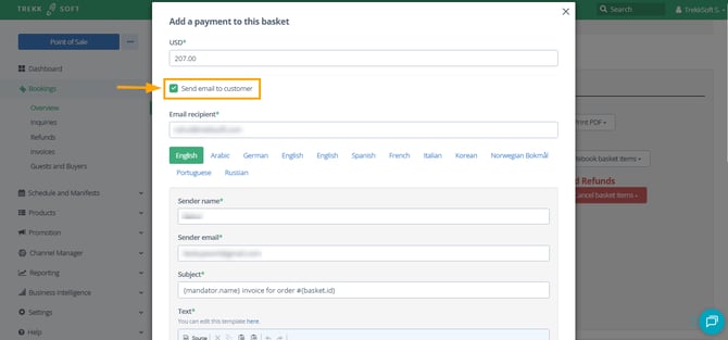 - To send it through TrekkSoft, click on the checkbox “Send email to customer”.