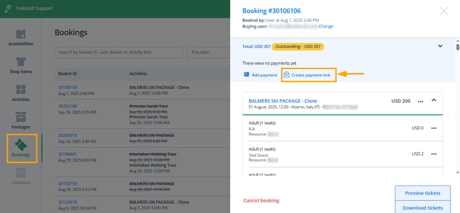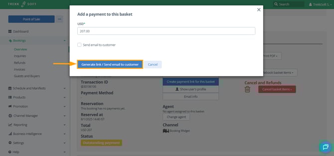 - Go to Admin Desk > Bookings > Overview and select the basket you want to generate the payment link for.