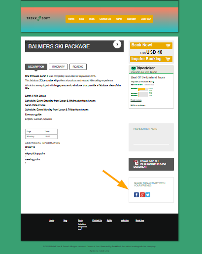 The social media buttons appear in the activity details page as highlighted in the example below (Harmony Theme):