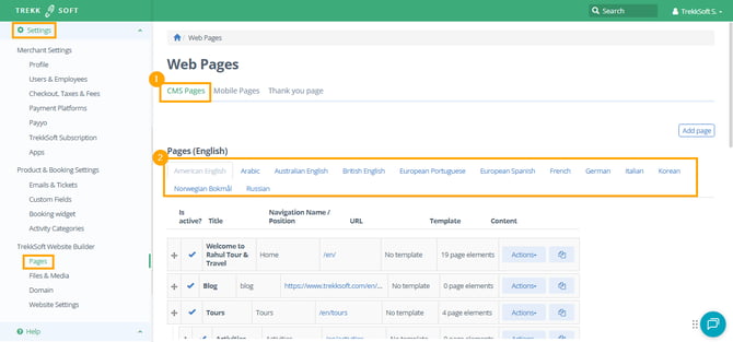 - Settings > TrekkSoft Website Builder > Pages > CMS Pages on the left navigation bar.