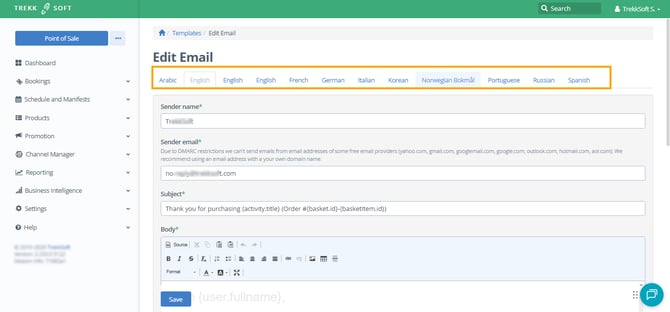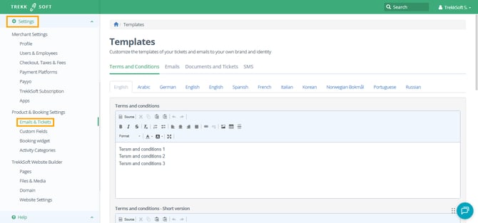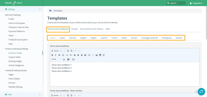 Templates, including Terms and Conditions, Emails Texts, and SMS, can be translated into multiple versions according to your enabled languages: