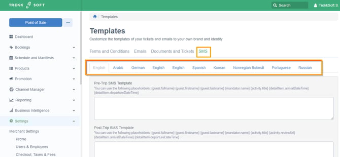 - SMS - Select the language to translate the Pre-Trip SMS Template and Post-Trip SMS Template from here.