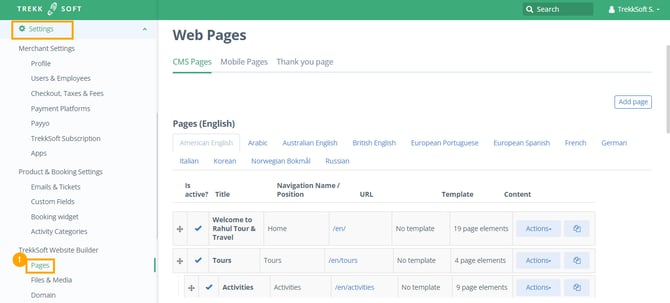 To add the TripAdvisor widget to other pages of your website, first, go to Settings > TrekkSoft Website Builder > Pages.