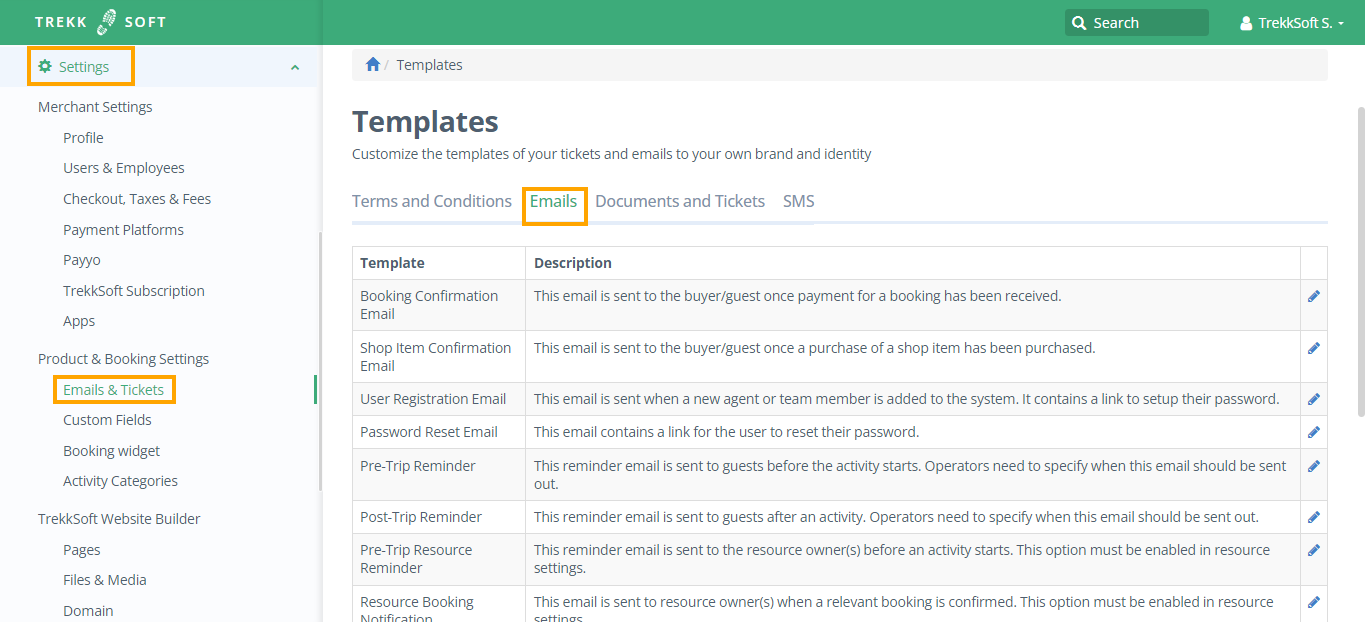 First, go to Settings > Product & Booking Settings > Emails & Tickets from the left menu and then click go to the Emails tab from the opened window in the right.