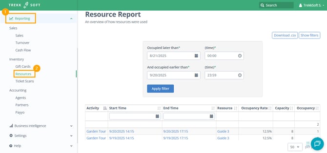 It shows how your resources are being used: for what activity they were used, for how long; and we calculate, based on the capacity and the occupancy, the occupancy rate: