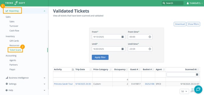 If you use the TrekkSoft mobile app (mPOS) to scan the tickets your customers bring with them to mark them as arrived or make sure they’ve paid, or check anything related to their reservation on sight, you can see in this report what tickets were scanned, by whom and when.