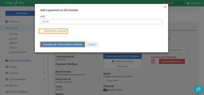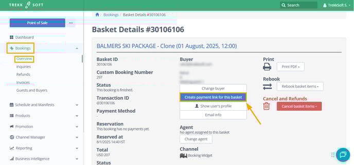 To create this link, go to Admin Desk > Bookings > Overview and select the basket you want to generate the payment link for.