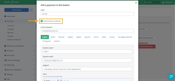To send it through TrekkSoft, click on the checkbox “Send email to customer”.