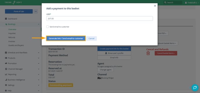 To create this link, go to POS Desk > Bookings and select the basket you want to generate the payment link for.